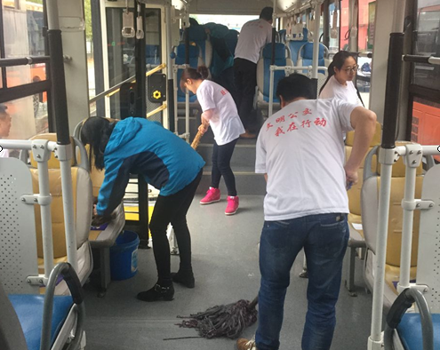 圖為青年志愿者正在對(duì)公交車車廂進(jìn)行清潔